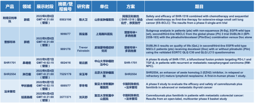 2022 ASCO年会另有5款AG亚游集团医药上市前抗肿瘤创新药的相关研究被接收为壁报,包括SHR-1316、普那布林、法米替尼、SHR-1701和SHR2554,他们的单药或联合方案相关7项研究被接收为壁报,覆盖肺癌、鼻咽癌、淋巴瘤、甲状腺癌和结直肠癌等领域。